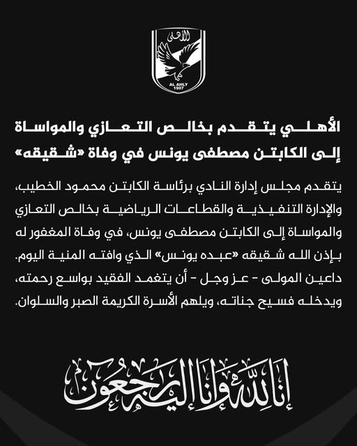 أصدر النادي بيانًا رسميًا يعلن فيه تقديم مجلس الإدارة، برئاسة الكابتن محمود الخطيب، خالص التعازي والمواساة إلى الكابتن مصطفى يونس، نجم النادي الأسبق، في وفاة شقيقه المغفور له بإذن الله “عبده يونس”، الذي وافته المنية اليوم.