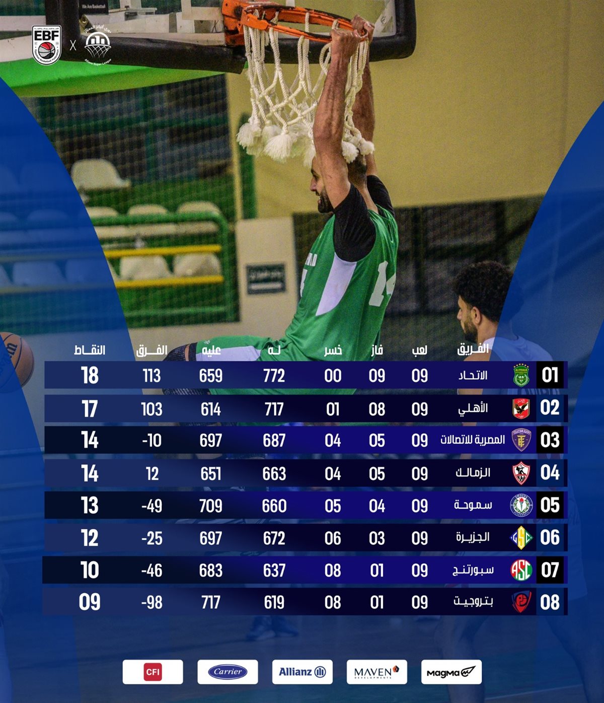 تصدر فريق كرة السلة بنادي الاتحاد السكندري ترتيب دوري أليانز الممتاز بعد انتهاء الجولة التاسعة برصيد 18 نقطة ليعتلي صدارة جدول الترتيب.